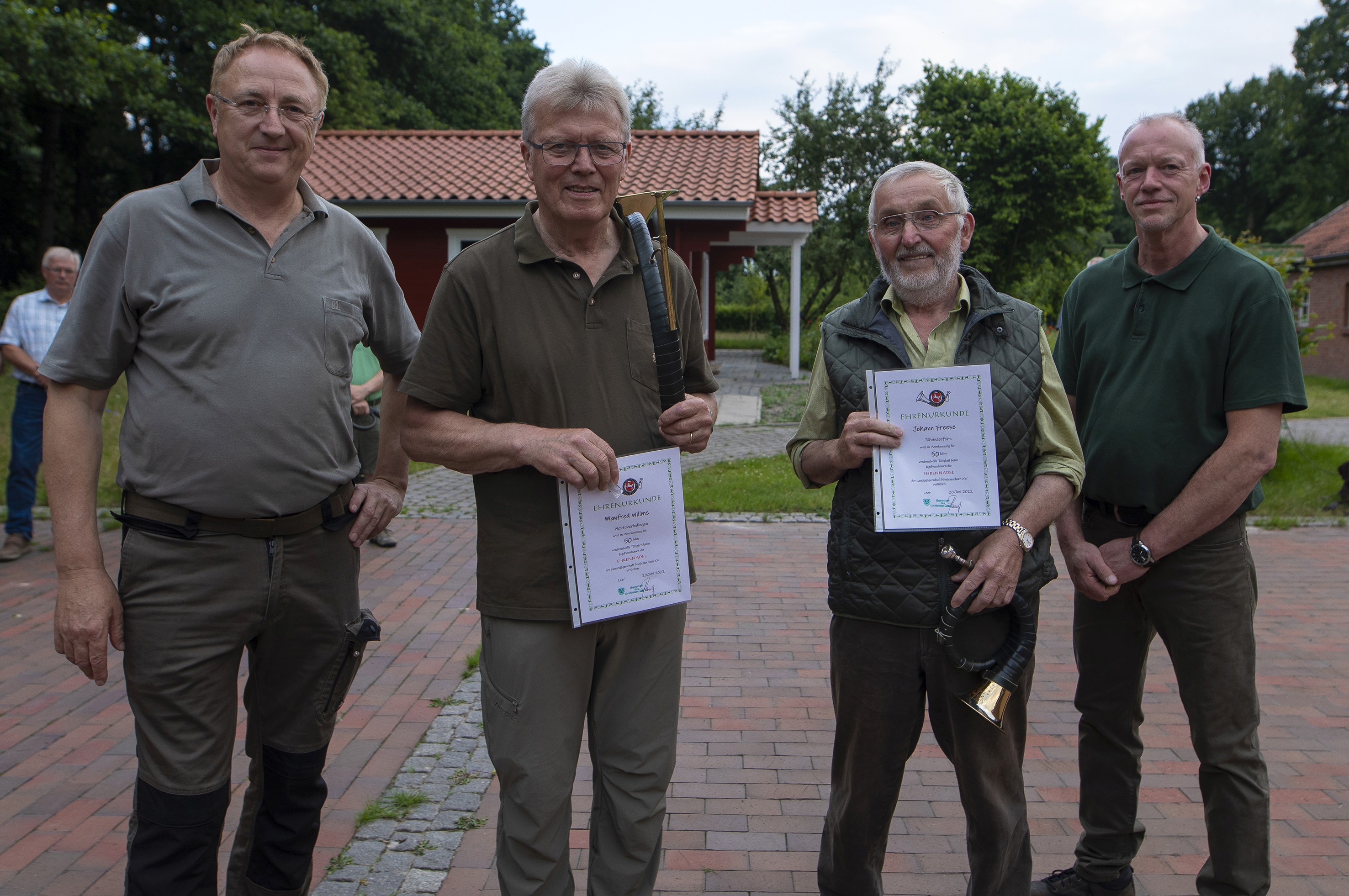 Manfred Willms und Johann Freese aus der Bläsergruppe Overledingen wurden sogar für über 50 Jahre Jagdhornblasen geehrt.