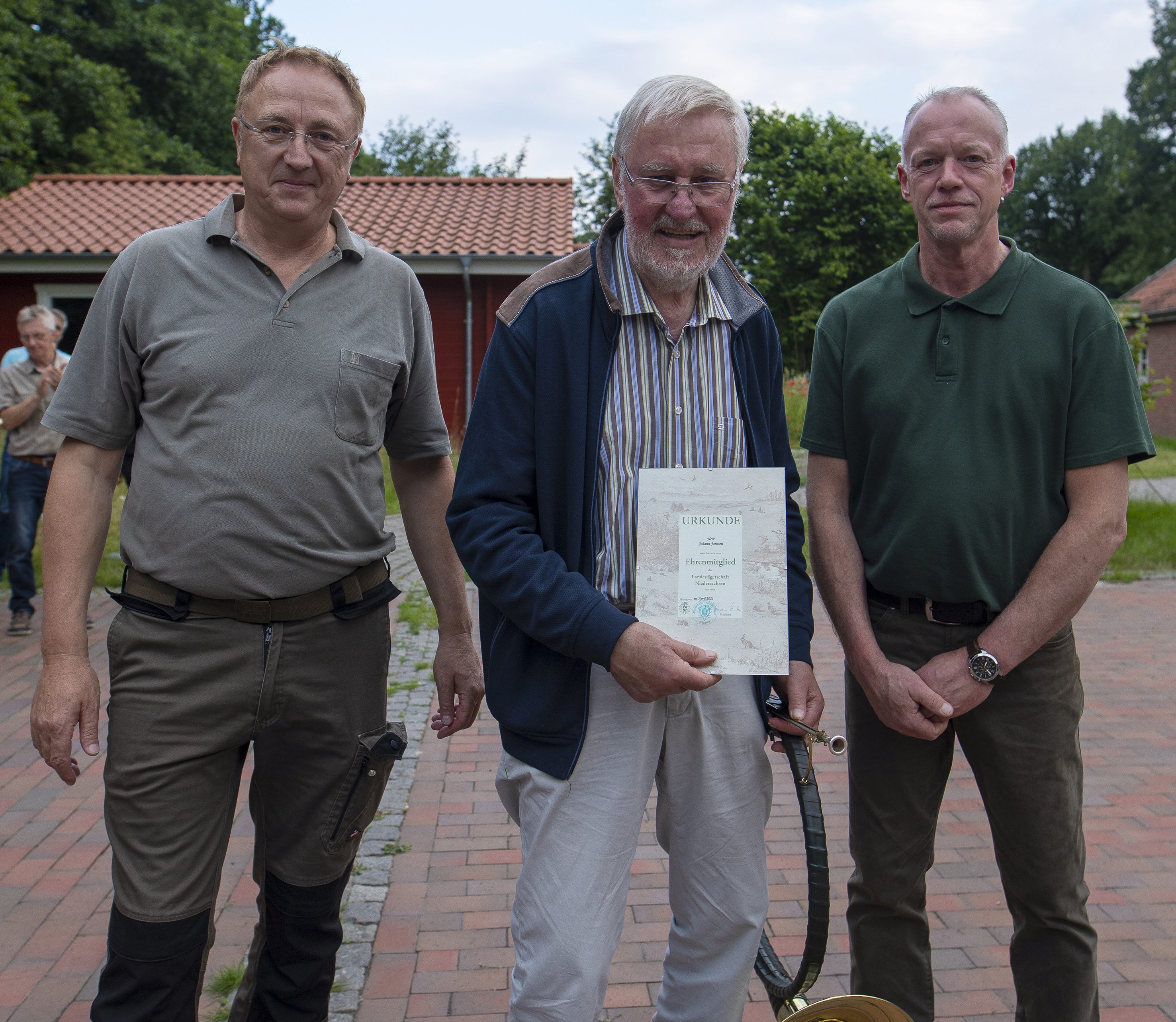 Corona bedingt waren Ehrungen verdienter Bläser nicht möglich. Dieses wurde jetzt vom Kreisbläserobmann nachgeholt. Der stellvertretende Jägerschafts-Vorsitzende Carl-Heinz Schmidt und Hegeringleiter Siegfried Heyen konnten 14 anwesenden Bläsern die Urkunden über langjähriges Blasen überreichen.